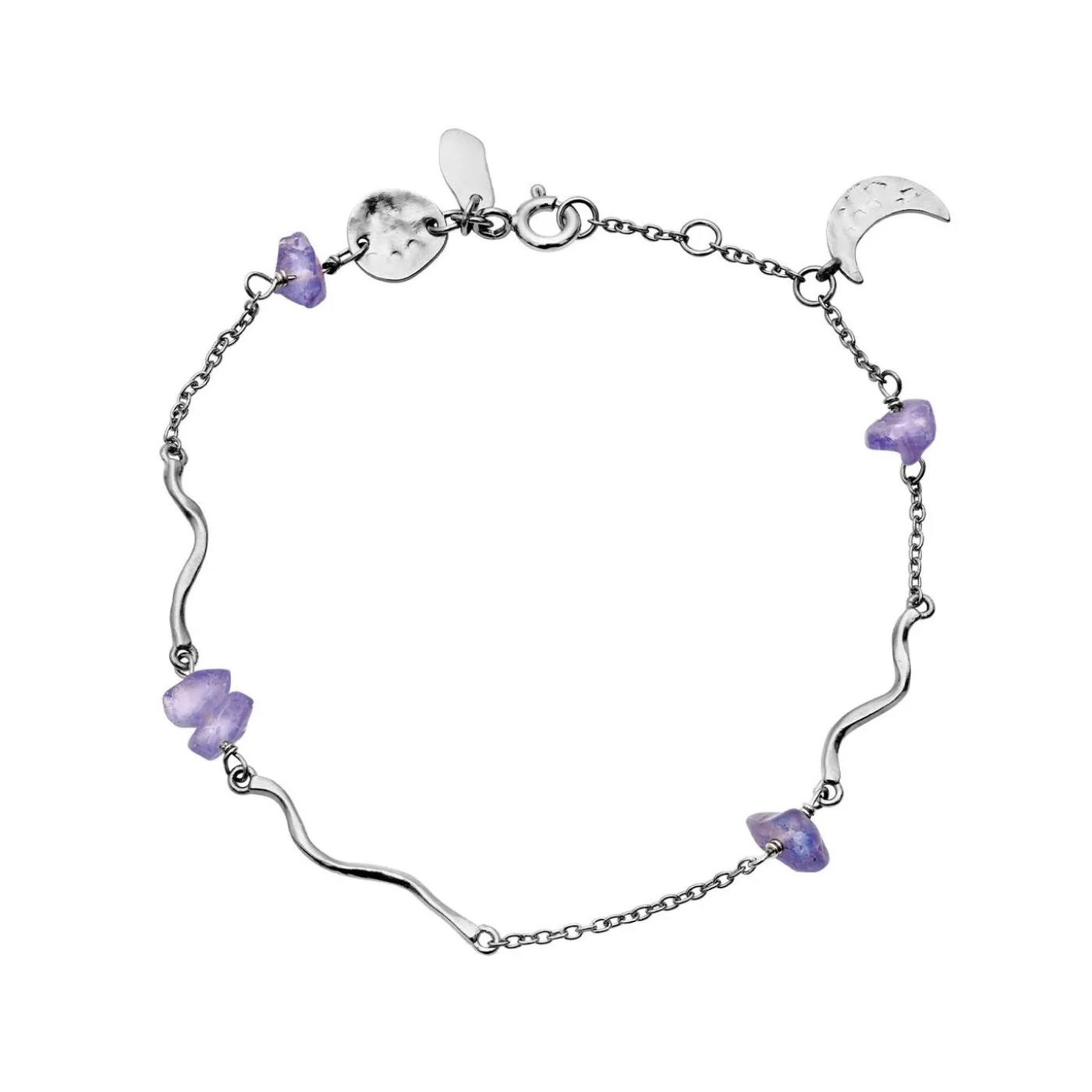 Den Afrikanske Tanzanit Er Ikke Kun Populær For Sin Smukke Blå-Lilla Nuance, Men Lige Så Meget For Sine Egenskaber. Den Står For Forandring Og For At Bryde Gamle Mønstre, Den Siges At Berolige Og Bevare Fokus På Det Vigtige. I Lillith Bracelet Er Tanzanitten I Selskab Af Fine, Hammerslåede Elementer Og En Elegant Halvmåne.