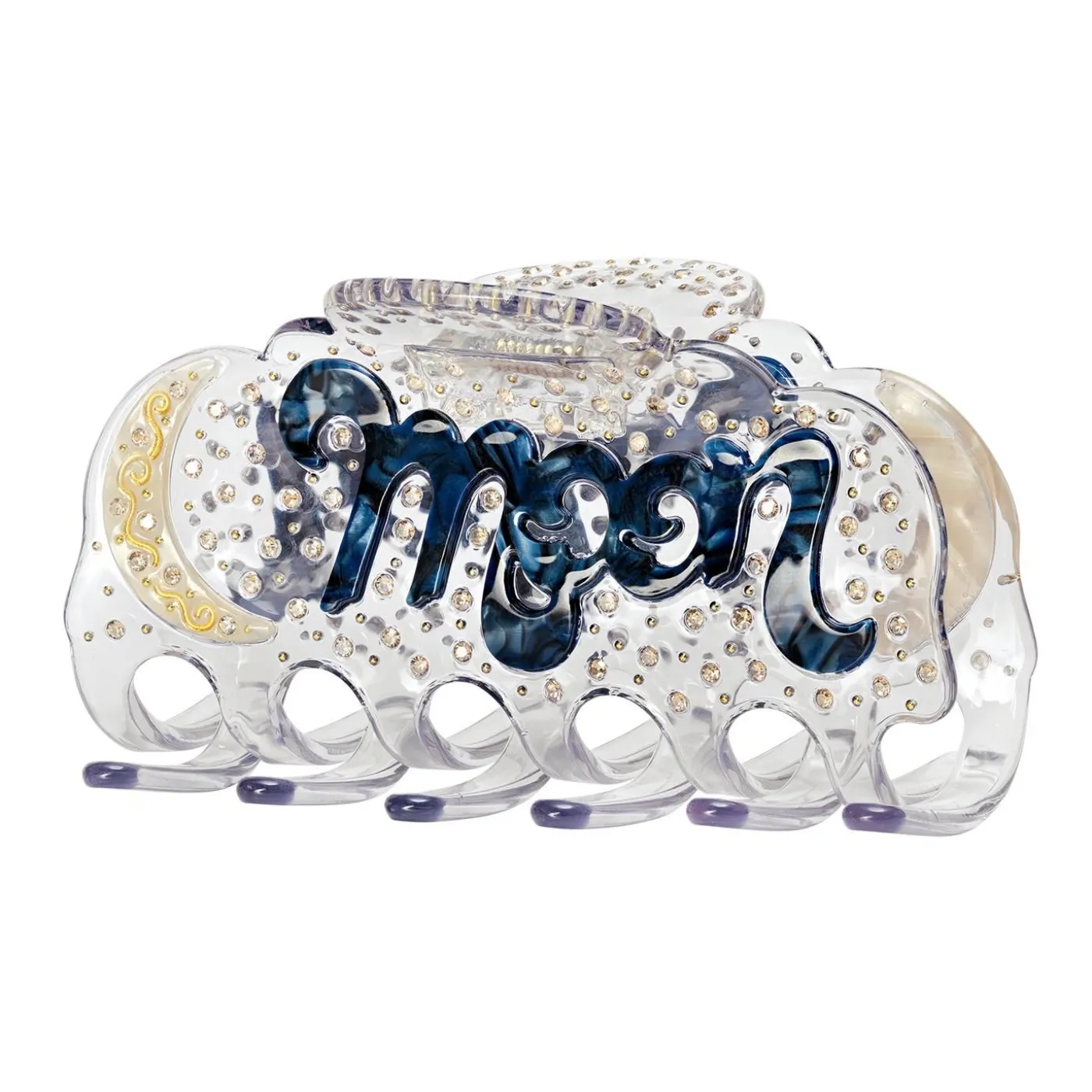 Cosmo Clear Sky Hair Claw Er En Del Af Maanestens A/W 23-Kollektion, Moon Hunter, Der Hylder Den Græske Gudinde, Artemis. En Legendarisk, Feministisk Figur I Græsk Mytologi, Som Maanesten Nyfortolker I En Moderne Udgave, En Nutidens Gudinde, Der Følger Sin Egen Vej I Livet Og Natten. Artemis Var Gudinde For Jagt, Beskytter Af Unge Kvinder, Forbundet Til Månen, Til Musikken Og Naturen. Alle Disse Symboler Er Til Stede I Accessory-Kollektionen, Hvor Måner, Hjerter Og Blomster Florerer Frit I Et Legende Univers I Vinterens Smukke Nuancer Tilsat Stjerne-Glitrende Rhinsten.Bredde: 9,5 Cm.Højde: 5 Cm. Materialer: Acetat, Metal Og Rhinsten.
