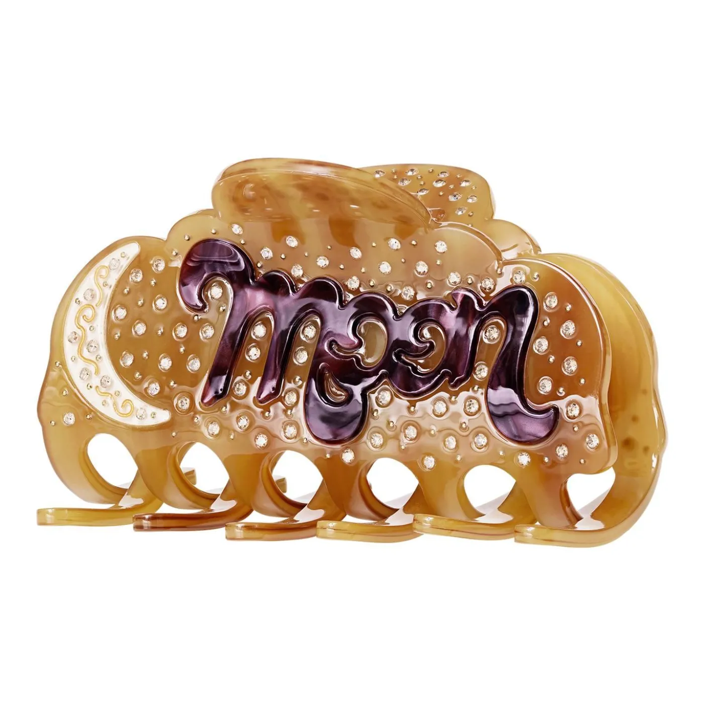 Den Magiske Hårklemme, Cosmo, Er Dekoreret Med En Skinnende Halvmåne, Og Så Er Ordet Moon Skrevet På Fineste Vis. Den Er Skabt I Et Karamelfarvet Acetat Og Dekoreret Med Lysegule Krystaller, Der Ligner Stjerner På Nattehimlen.