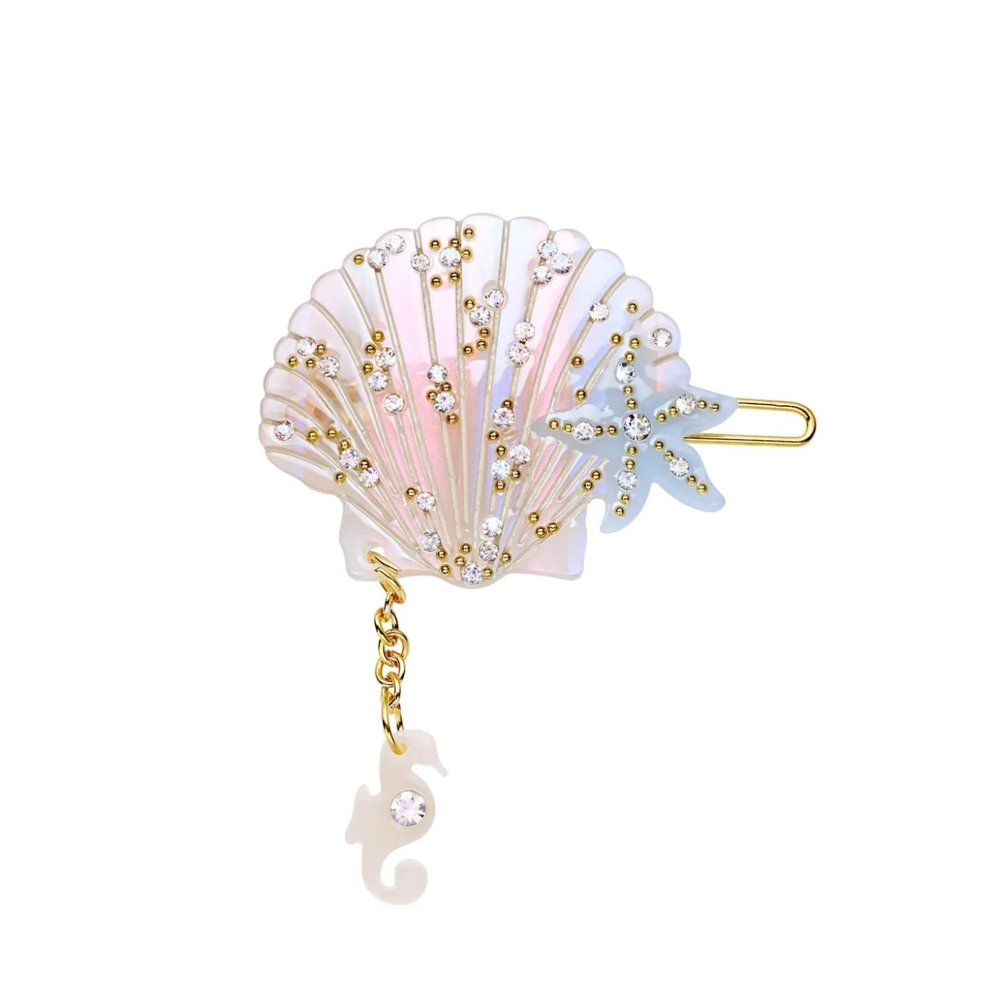 Tilføj Dét Ekstra Til Dit Sommerlook Med Sisela Hårklipsen, Der Med Sin Muslingeform, Changerende Farver, Glimtende Rhinsten Og Et Lille Søhestvedhæng Lyser Din Dag Op.