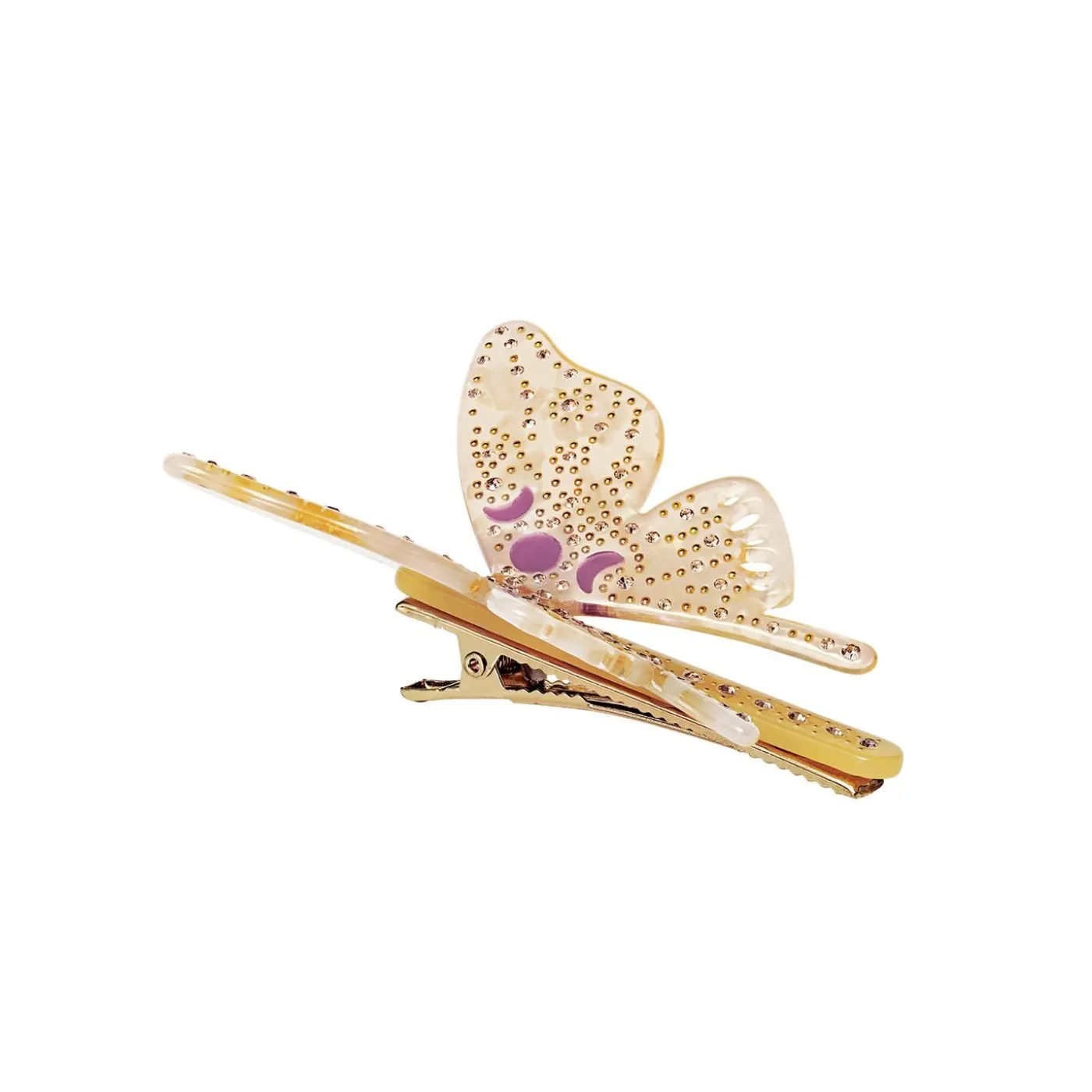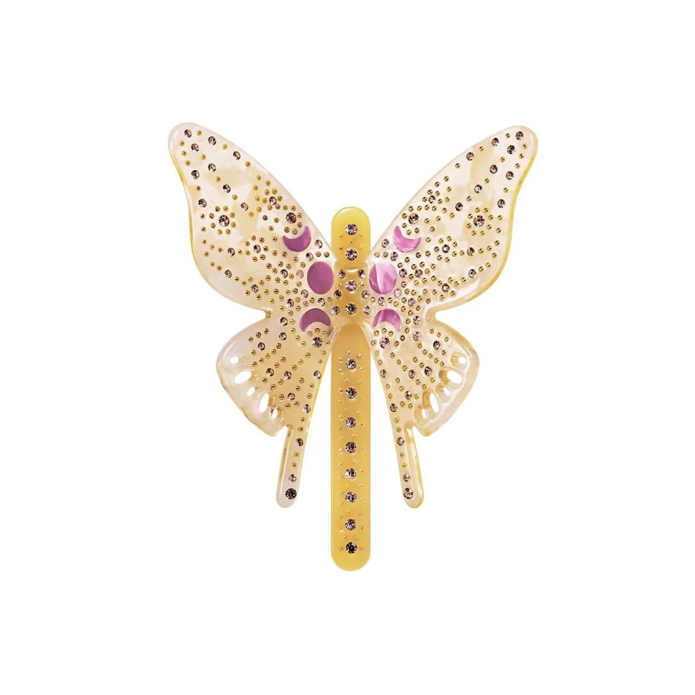 Vanessa Har Form Som En Sommerfugl, Der Spreder Sine Vinger Og Sætter Sig I Dit Hår. Sommerfugle Repræsenterer Nye Begyndelser Og Håb. Hårspændet Er Lavet Af Ferskenfarvet Og Gult Acetat Og Dekoreret Med Lysegule Krystaller.