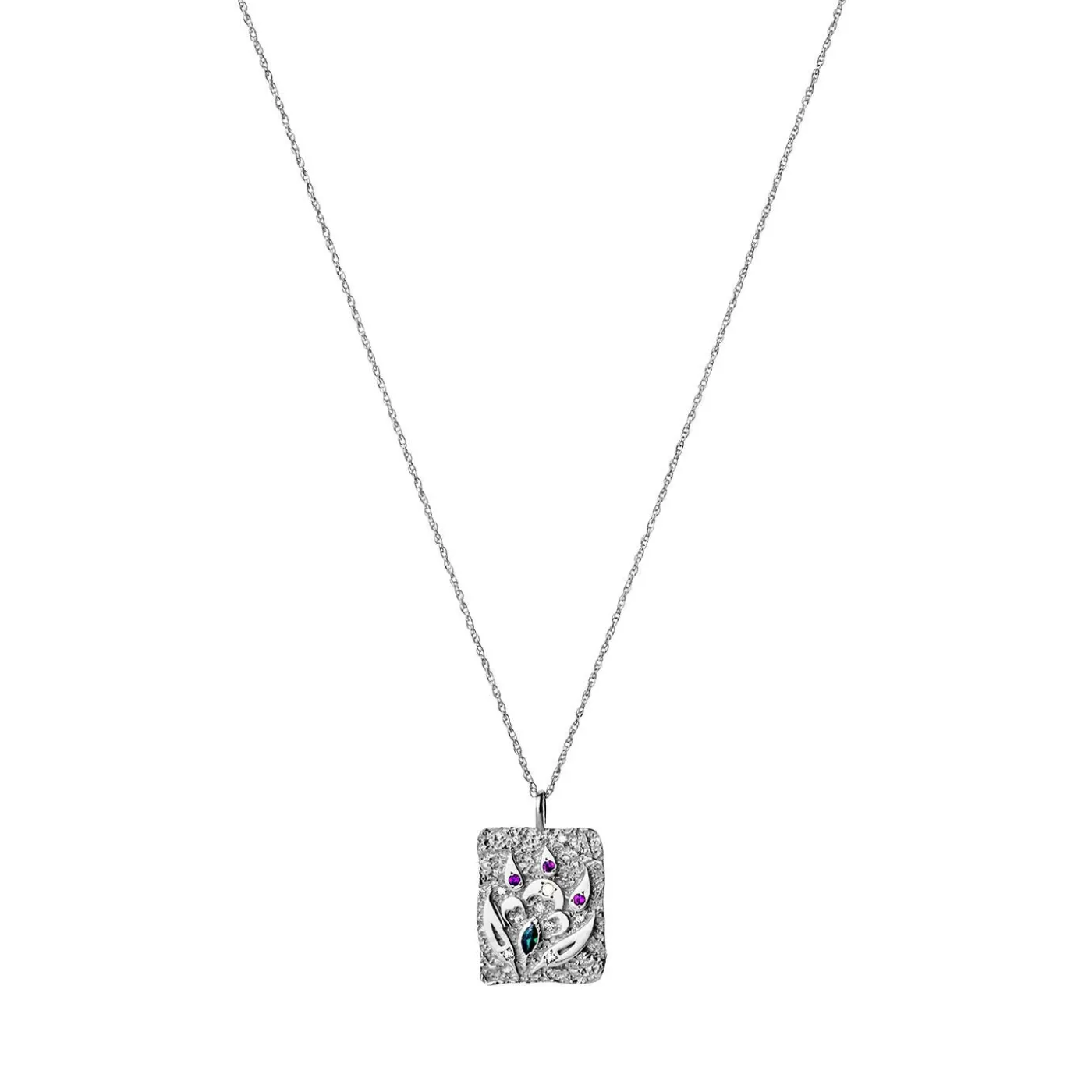 Halskæden Leger Med Blomsternes Delikate Natur, Alsidighed Og Forunderlige Former. Vedhængets Polerede Detaljer Mod Den Organiske Overflade Danner Et Abstrakt Og Betagende Blomstermotiv, Udsmykket Med Farverige Zirkoner Og Funklende Opal.