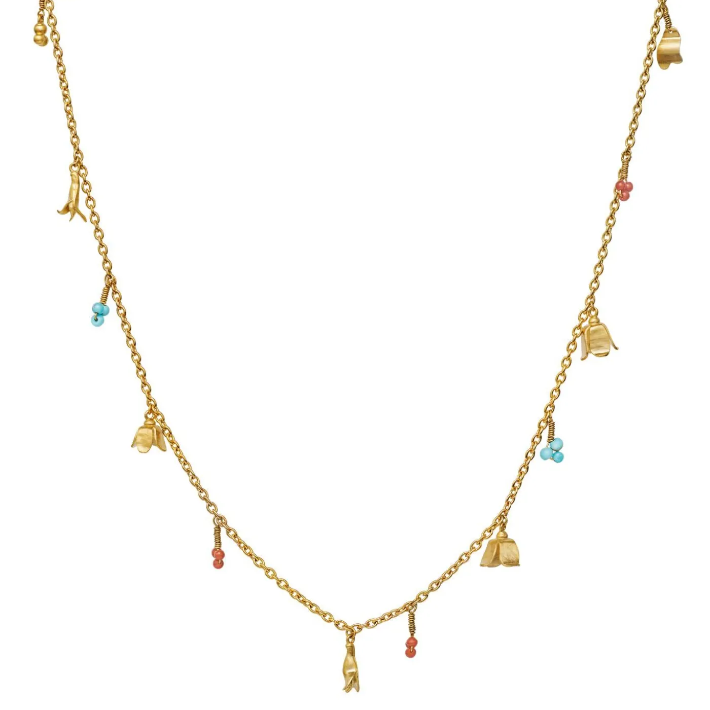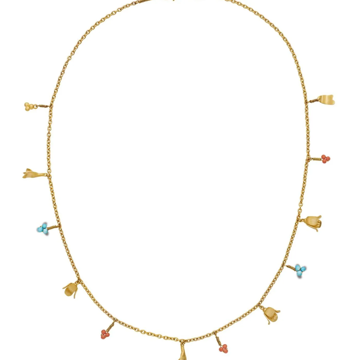 I Bluebell-Halskæden Ses Alt Det Bedste I Maanesten X Olga Bonne-Kollektionen; De Fine Sommerblomster På Den Karakteristiske Kæde Komplimenteret Af Turkisernes Og Korallernes Dragende Farver. Kollektionen Er En Hyldest Til Ungdommen, Til Naturen, Til Håndværket Og Det Feminine Univers.