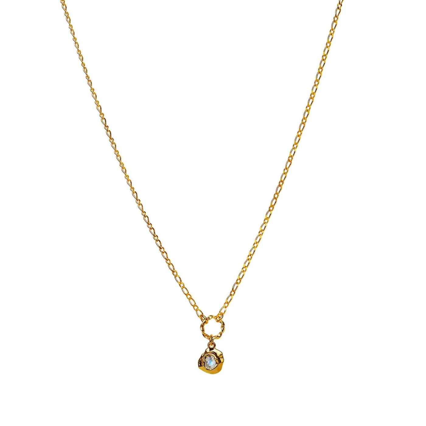 Denne Halskæde Har En Lille Facetteret Og Glimtende Labradorit Siddende I Et Vedhæng Med Smeltet Tekstur. Kæden Består Af En Smal Figaros Kæde Med En Lille Snoet Øsken, Hvori Den Lille Amulet Hænger.