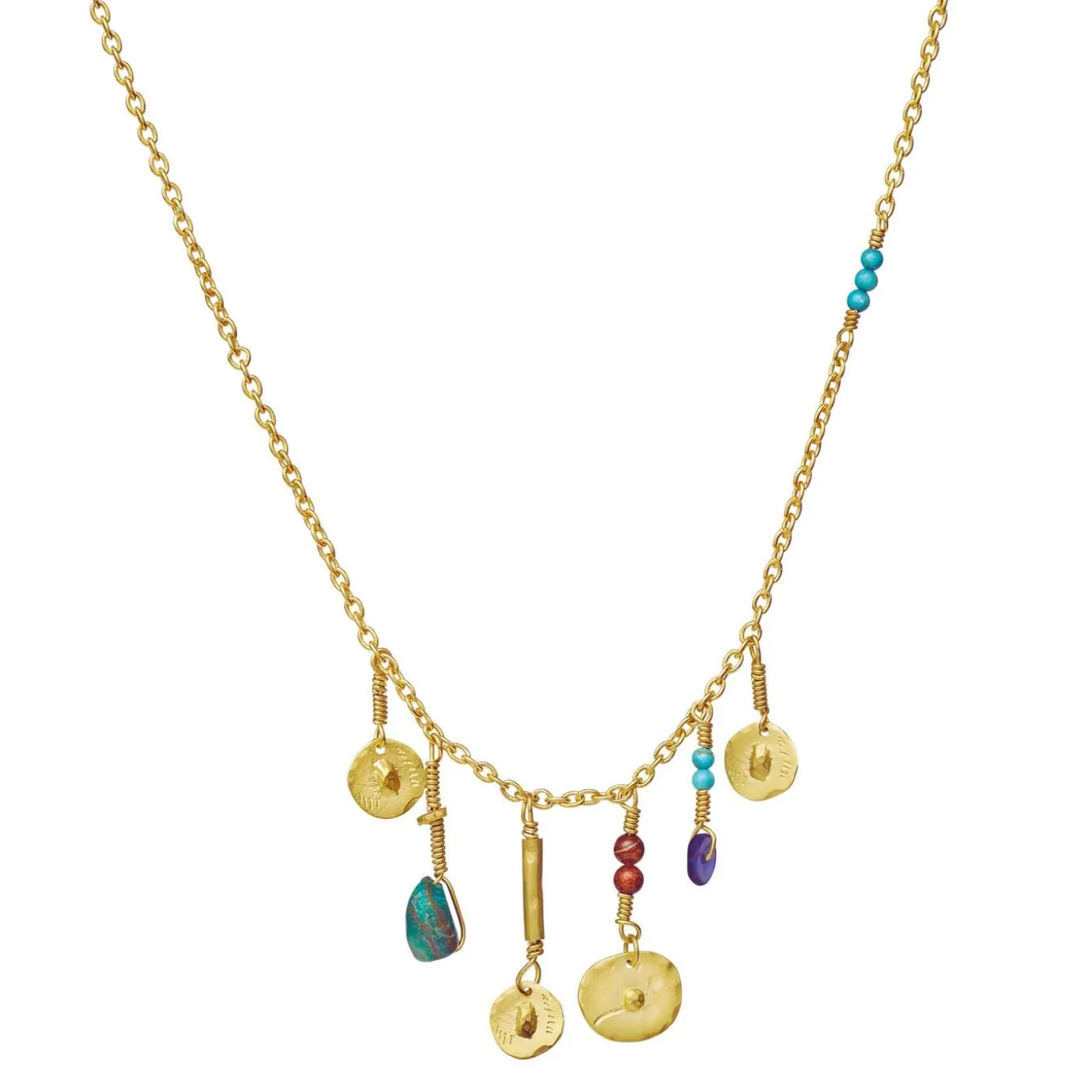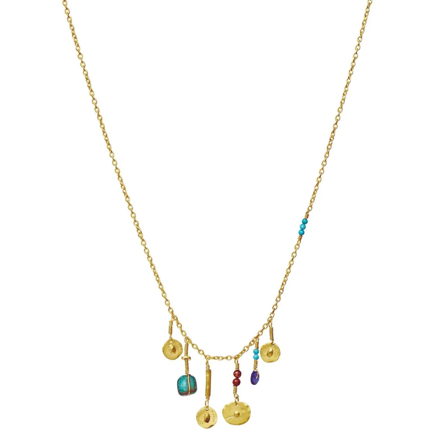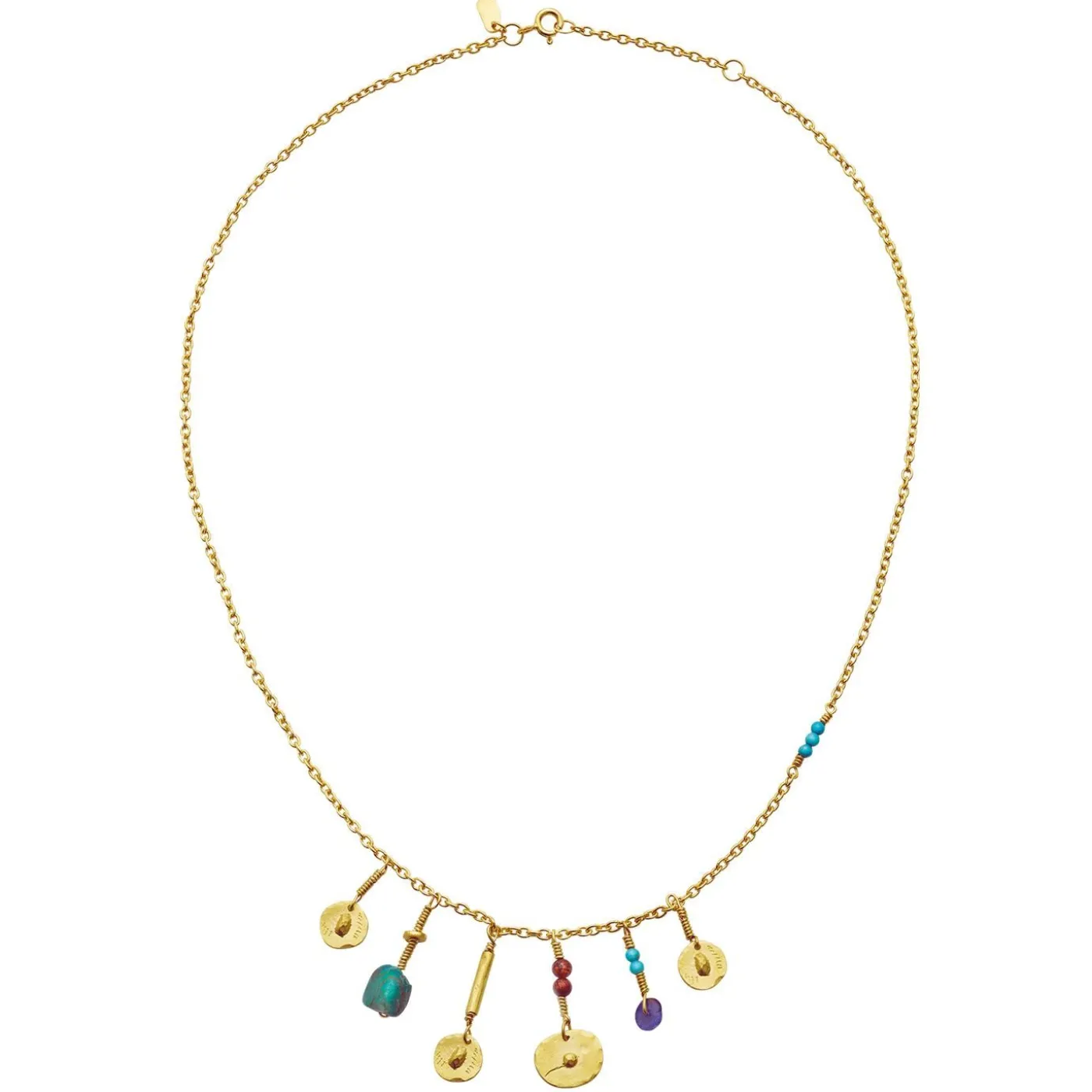 Glow Necklace Er Foruden Fine, Små, Gyldne Vedhæng Dekoreret Med Kraftfulde Sten. Turkis Har Længe Været Brugt Som En Beskyttende, Fredfyldt Amulet, Mens Den Røde Jaspis Er En Sten For Tryghed, Balance Og Jordbundethed.Halskæden Er En Del Af Samarbejdet, Olga Bonne X Maanesten, Der Fortolker Barndommens Oplevelser I Naturen Og Følelsen Af At Fortabe Sig I Skoven, Ved Markerne Og Havet. En Tid Med Utæmmet Fascination Og Magi, En Umiddelbar Vildskab I Hjertet Og Friheden Til At Følge Sin Egen Intuition Og Retning. Egenskaber, Der Er Så Lette At Miste, Men Så Vigtige At Beholde. Olga Bonne X Maanesten-Kollektionen Skaber Med Sine Organiske Former Og Symboler Og Naturlige Nuancer En Forbindelse Til Det, Der Var, Og Det, Der Skal Blive.
