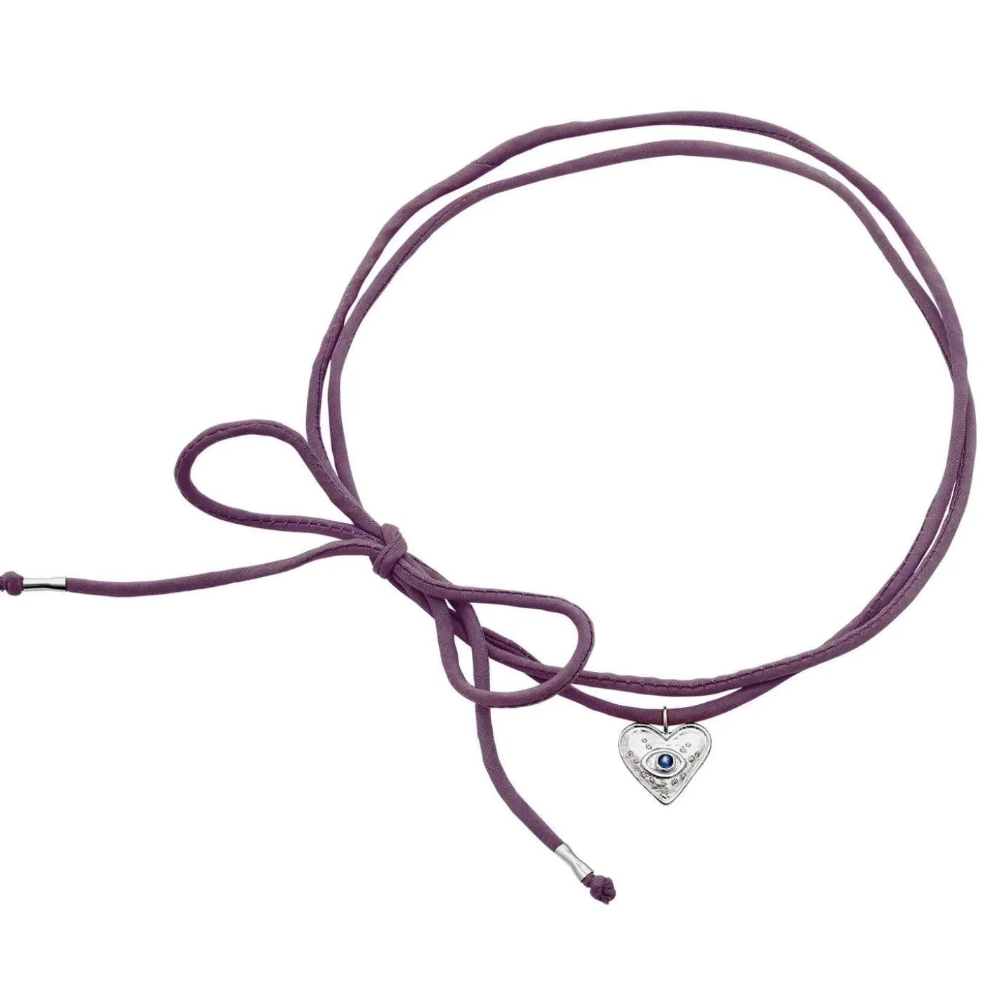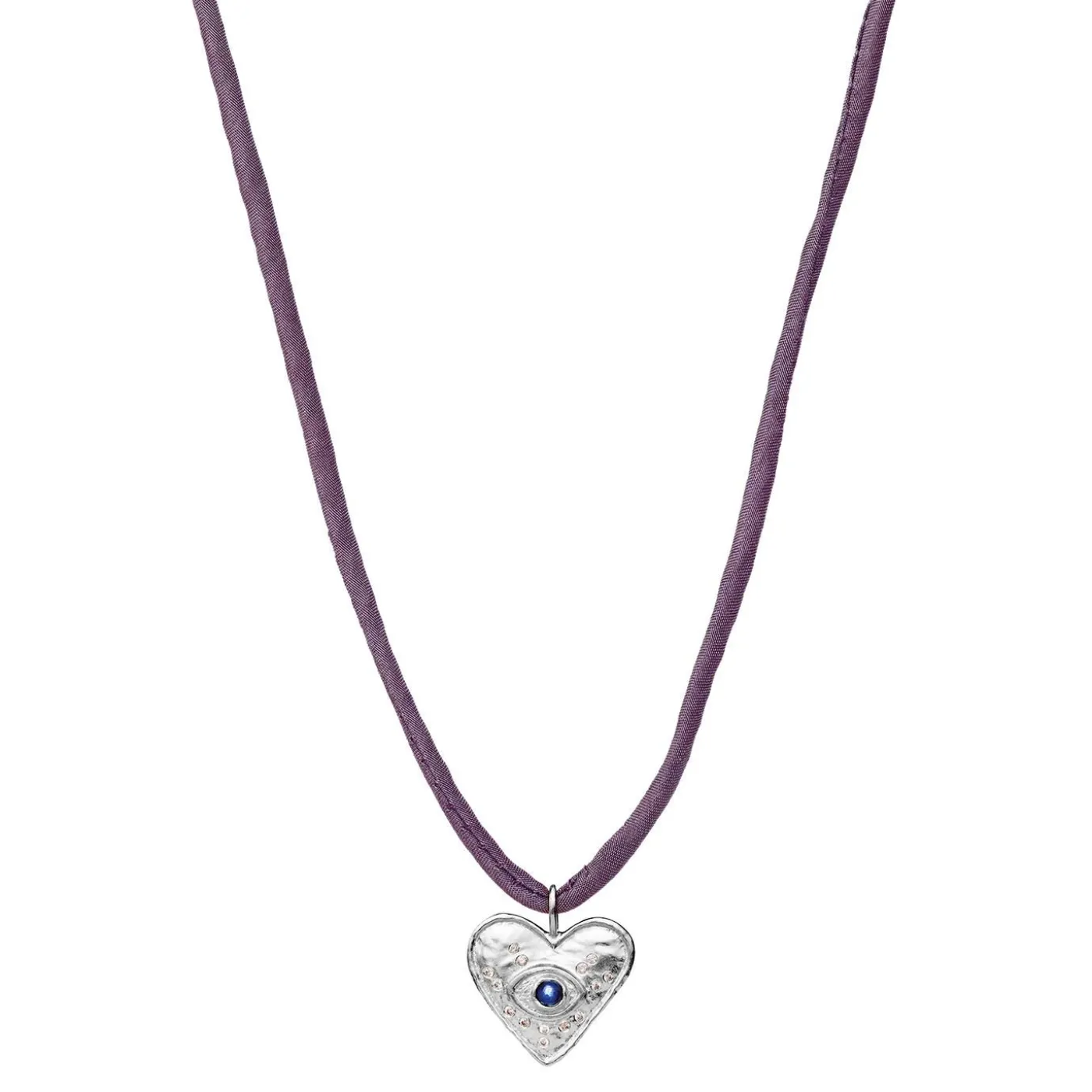 Det Fine Silkebånd I Støvet Lilla Nyfortolker Chokeren, Mens Det Hjerteformede Vedhæng Udstråler Ren Kærlighed. I Midten Ses Et Overvågent Øje Af Kyanit, Stenen For Ro Og Spiritualitet.