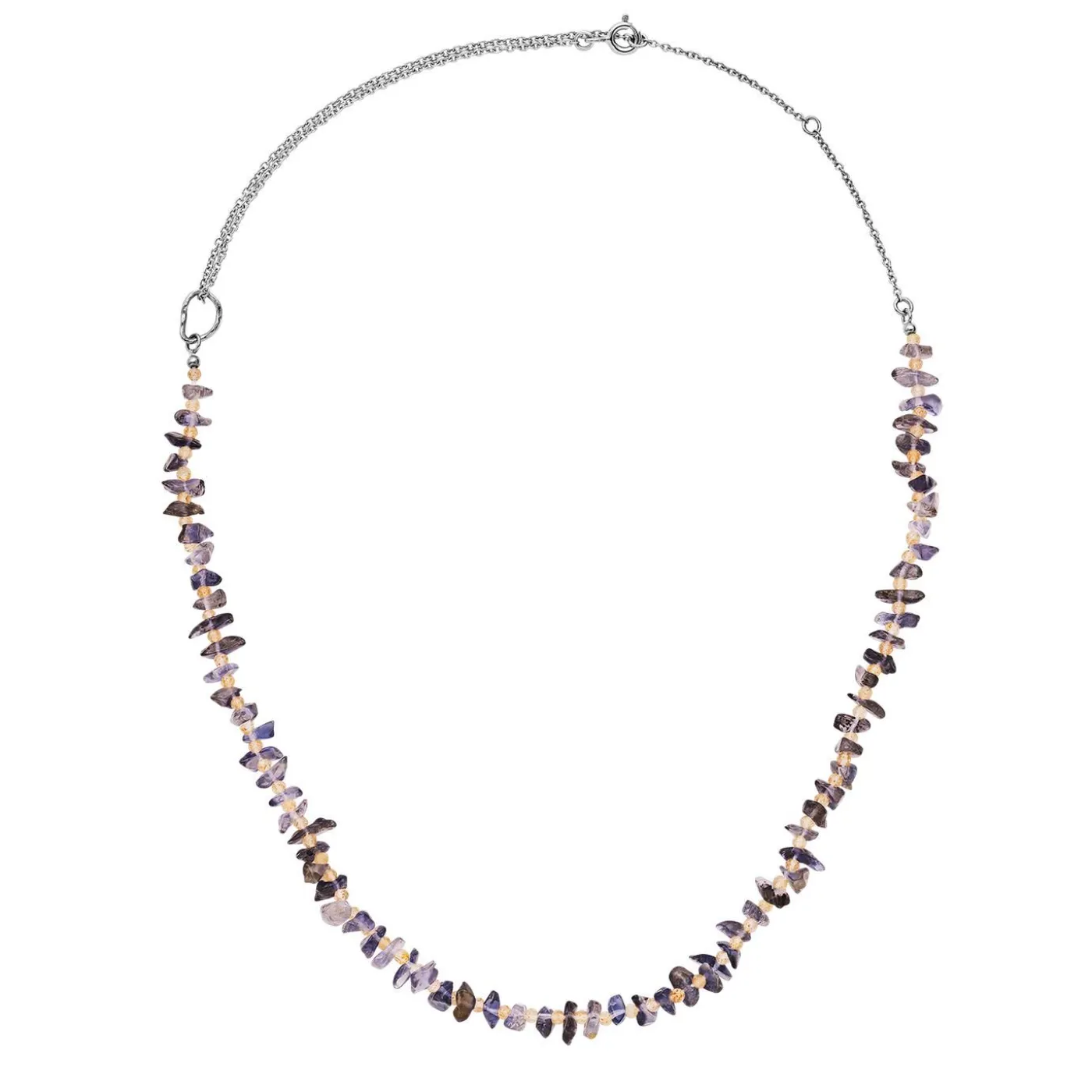 Iolit Er Drømmenes Og Rejsens Sten Og Siges At Guide Og Give Retning I Livet. Her Er Den Smukke Blå Iolit Forenet Med Den Lykkebringende Og Beskyttende Solsten. Sammen Giver De Riesme Halskæden Et Roligt Og Drømmende Udtryk. Halskæden Er Justerbar Og Kan Bæres Helt Kort Som Choker, Eller Som Halskæde I Flere Længder.