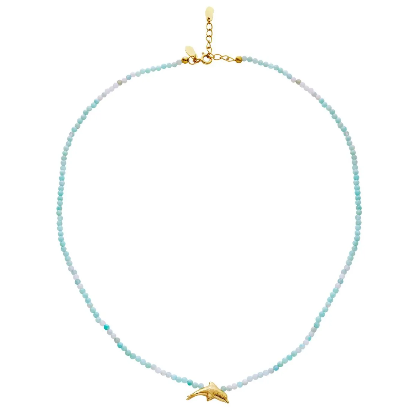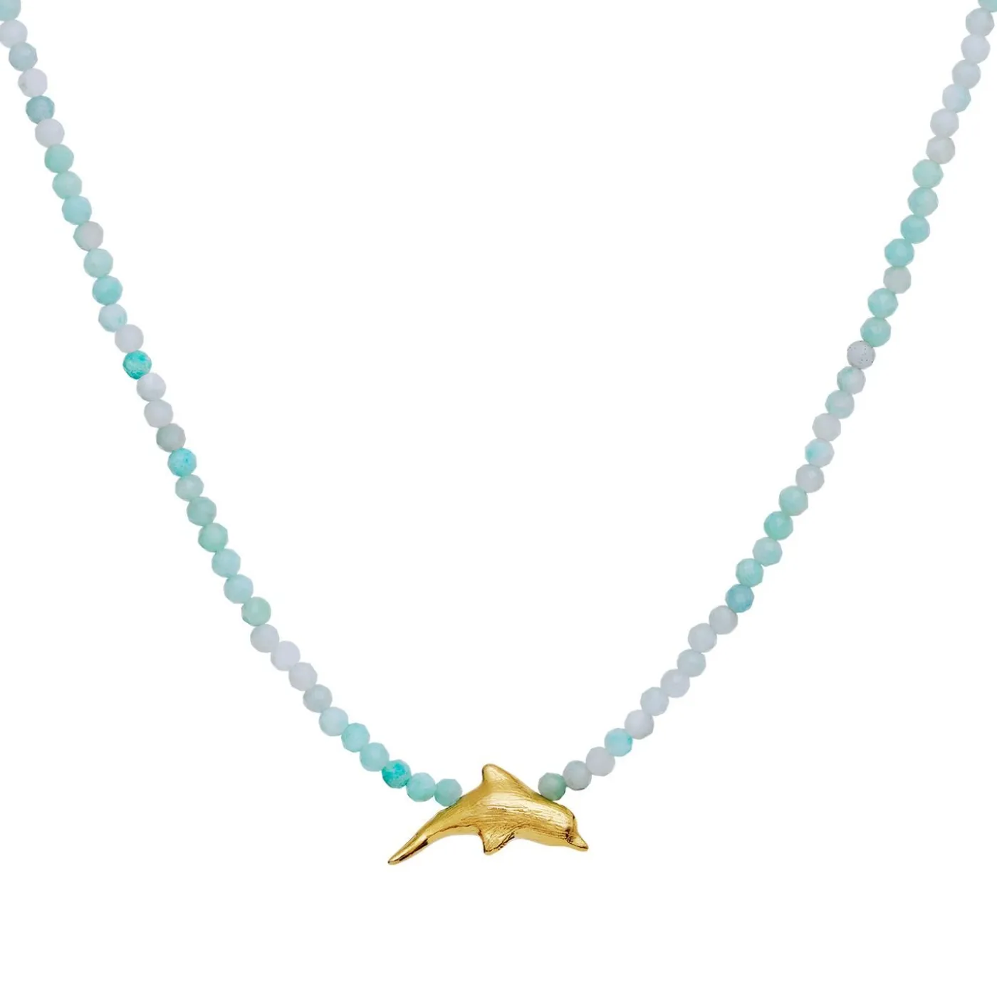 Amazoniter Siges At Berolige Nerverne Og I Kombination Med En Gylden Delfin — Symbolet På Fred Og Harmoni — Kan Din Sommer Kun Blive En Bølge Af Gode Stunder Med Tiki Halskæden Om Halsen.