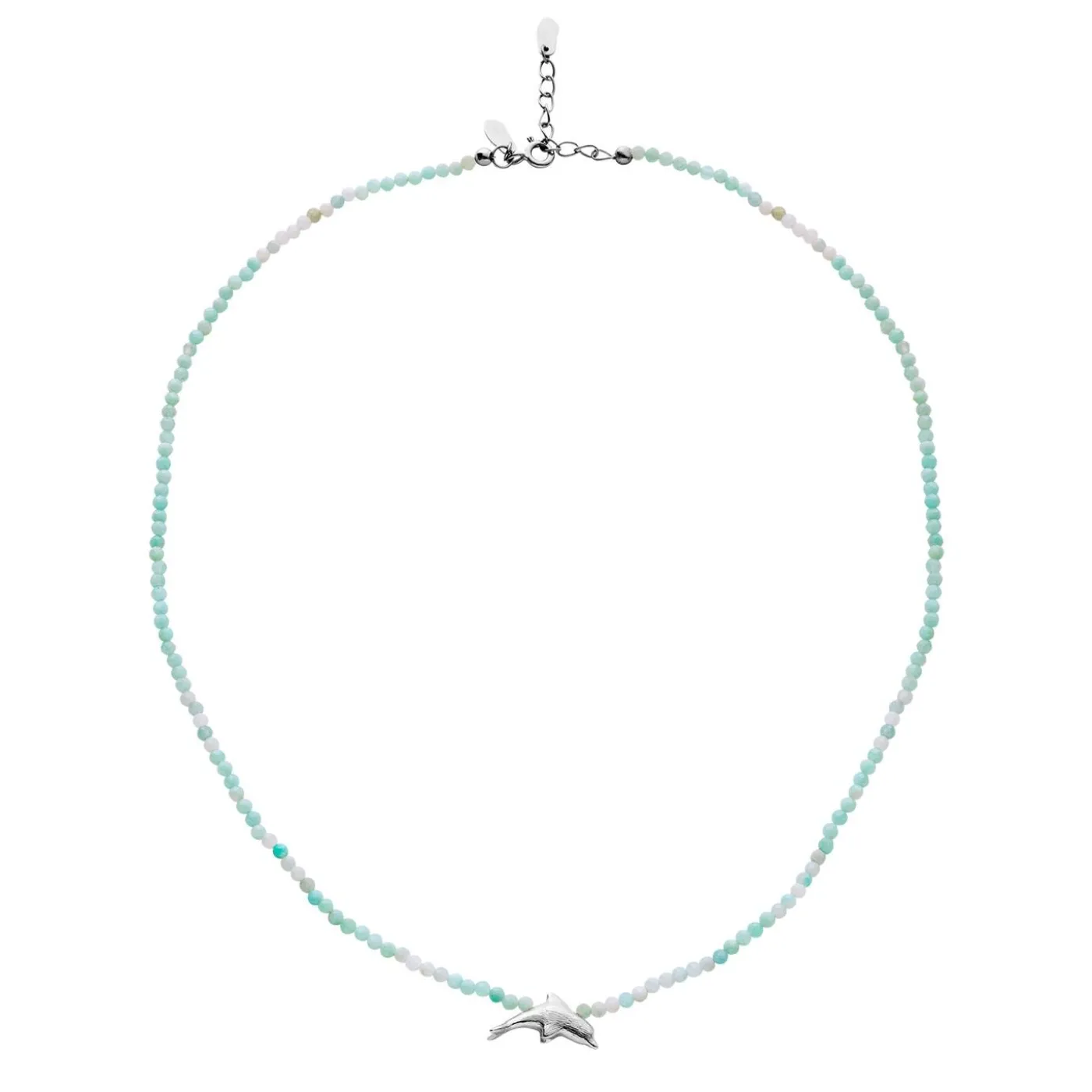 Amazoniter Siges At Berolige Nerverne Og I Kombination Med En Gylden Delfin — Symbolet På Fred Og Harmoni — Kan Din Sommer Kun Blive En Bølge Af Gode Stunder Med Tiki Halskæden Om Halsen.