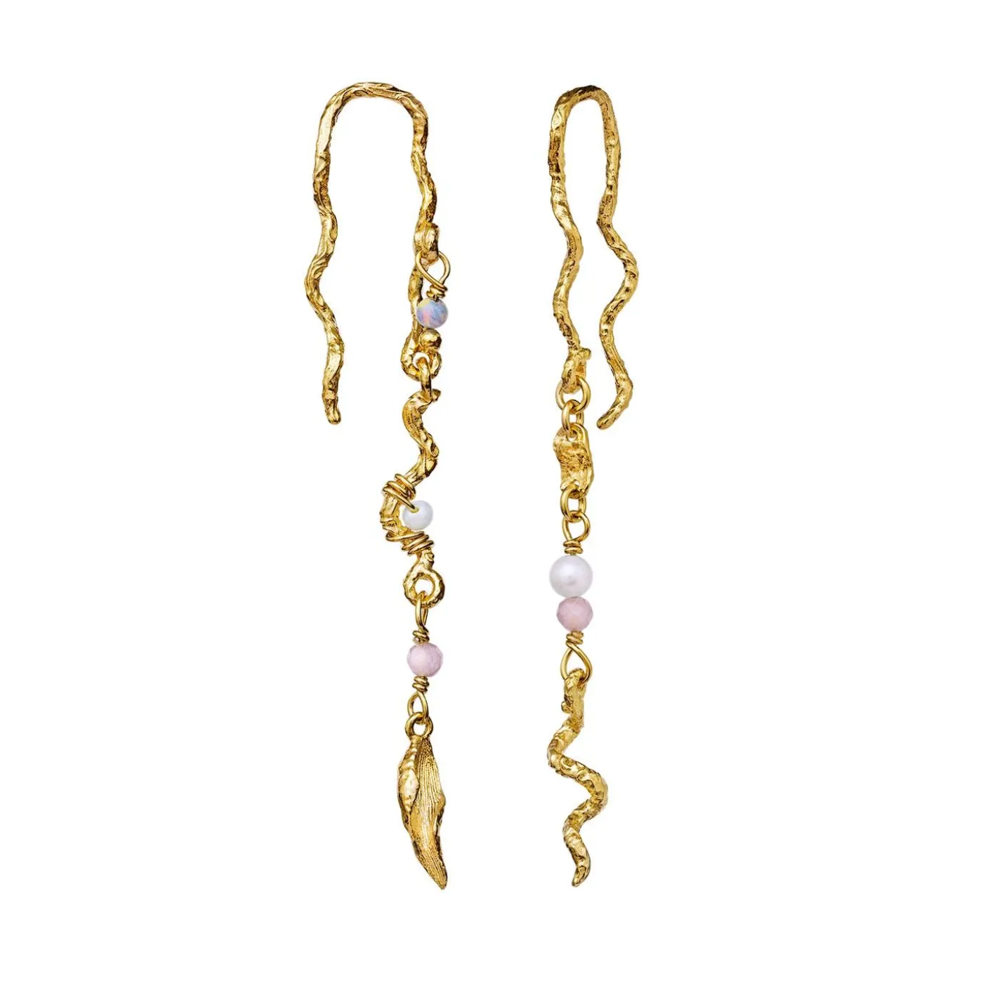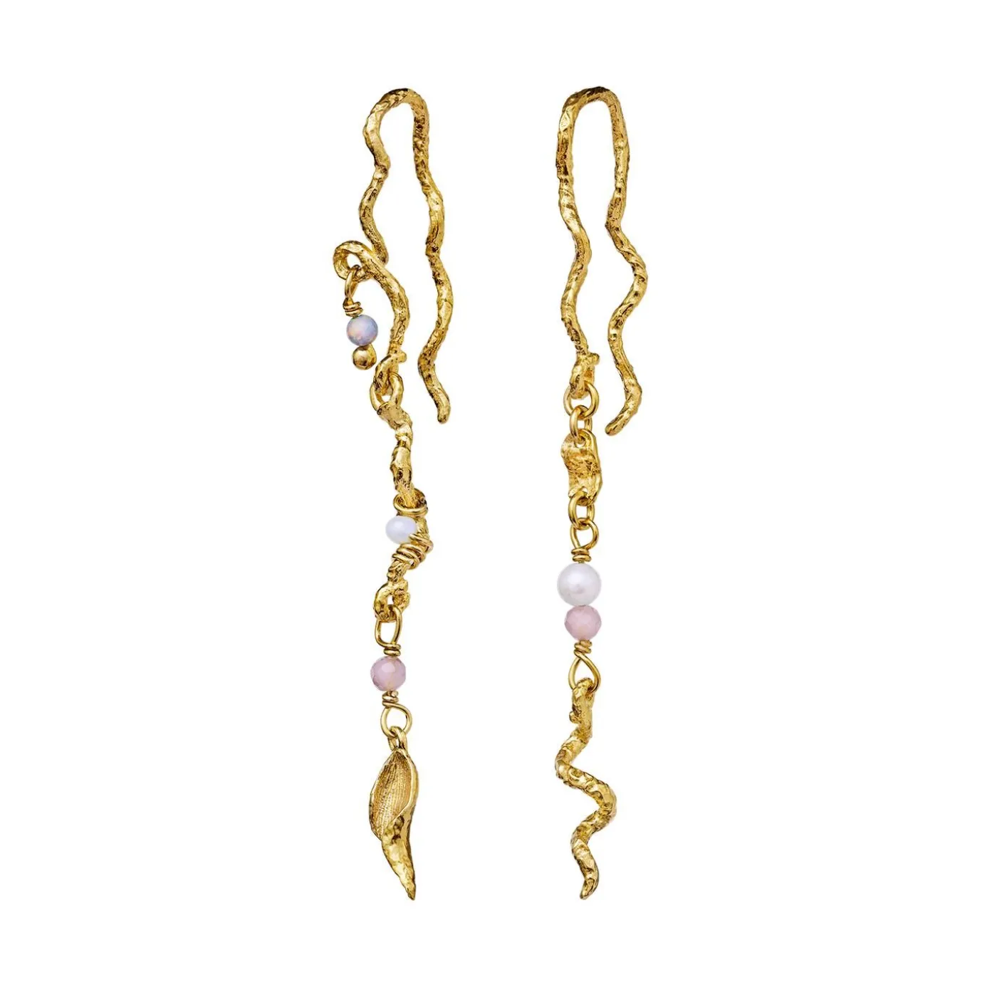 Elisa Øreringene Er Organiske Fra Rod Til Spids. De Falder Fra Øret Som Letkrøllede, Spinkle Spirer, Hvorfra Små Funklende Skatte I Form Af Eventyrlige, Små Blå Opaler, Akvamariner Og Fine Ferskvandsperler Titter Frem Og Danner Et Magisk, Dragende Farvespil.
