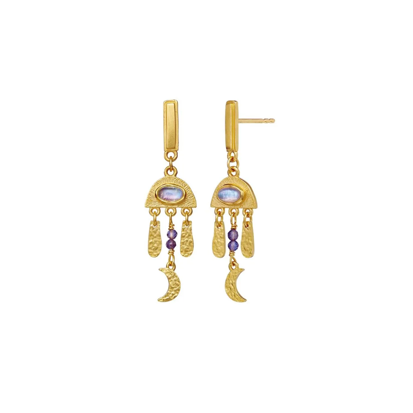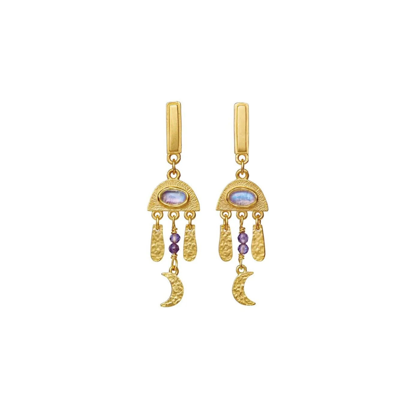 Regnbuemånestenen Lader Sit Legende Lys Falde Ned Over Små, Hammerslåede Elementer Og En Fin Halvmåne. Gemma Earrings Symboliserer Solen Og Månens Mytiske Skønhed Og Kræfter.
