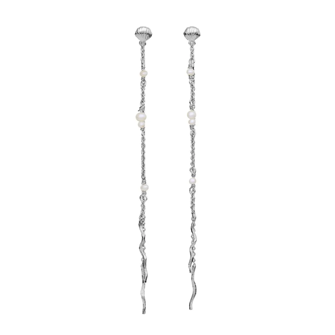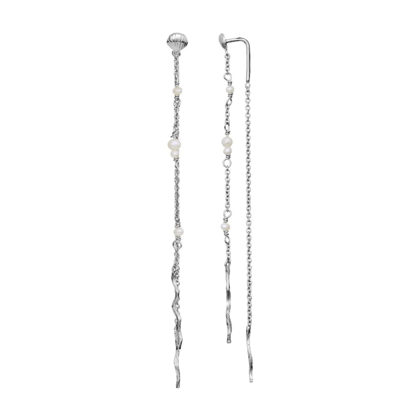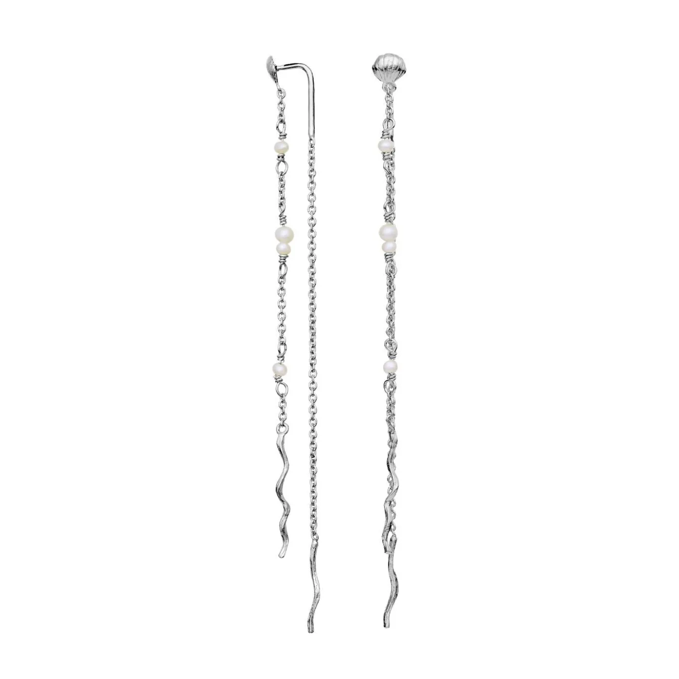 Lange Kæder Svajer Elegant Fra Sirena Øreringen Og Løber Som En Lille Strøm Af Rindende Vand Fra Øreflippen Langs Halsen, Med Skær Fra Dråber Af Ferskvandsperler.