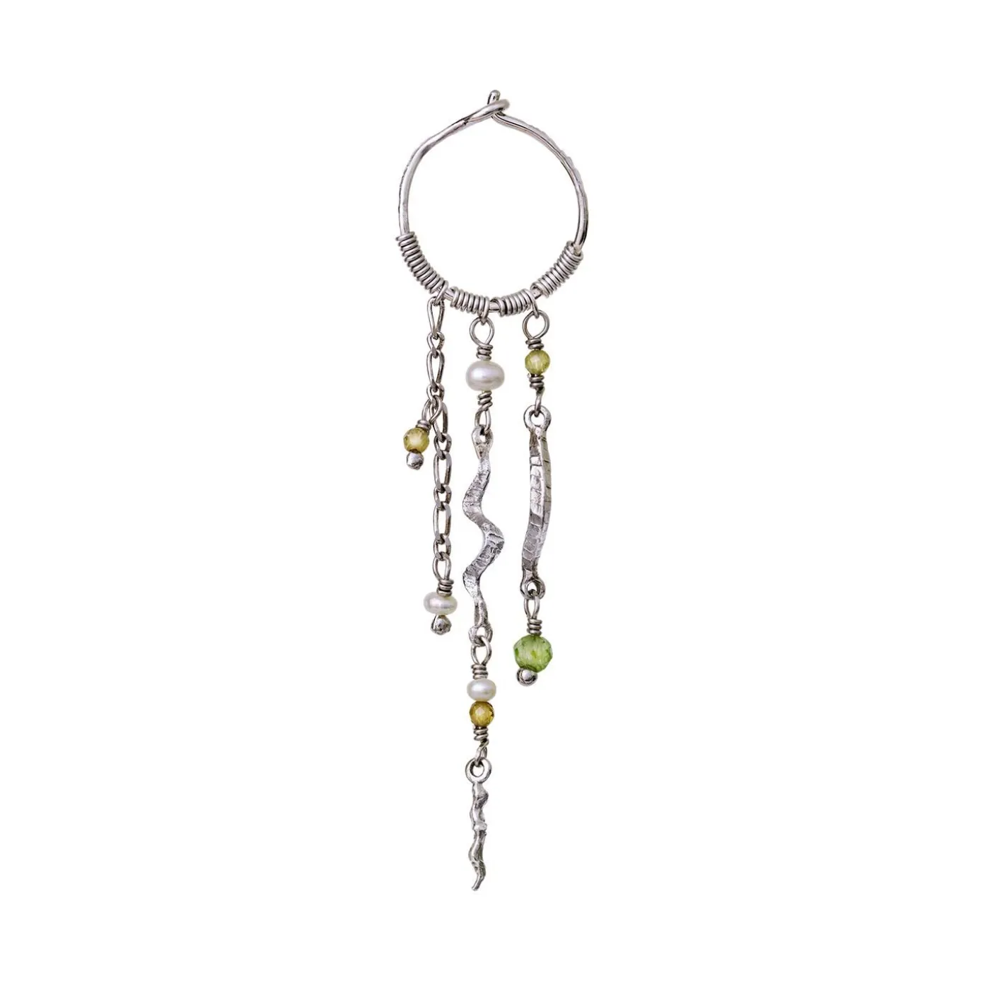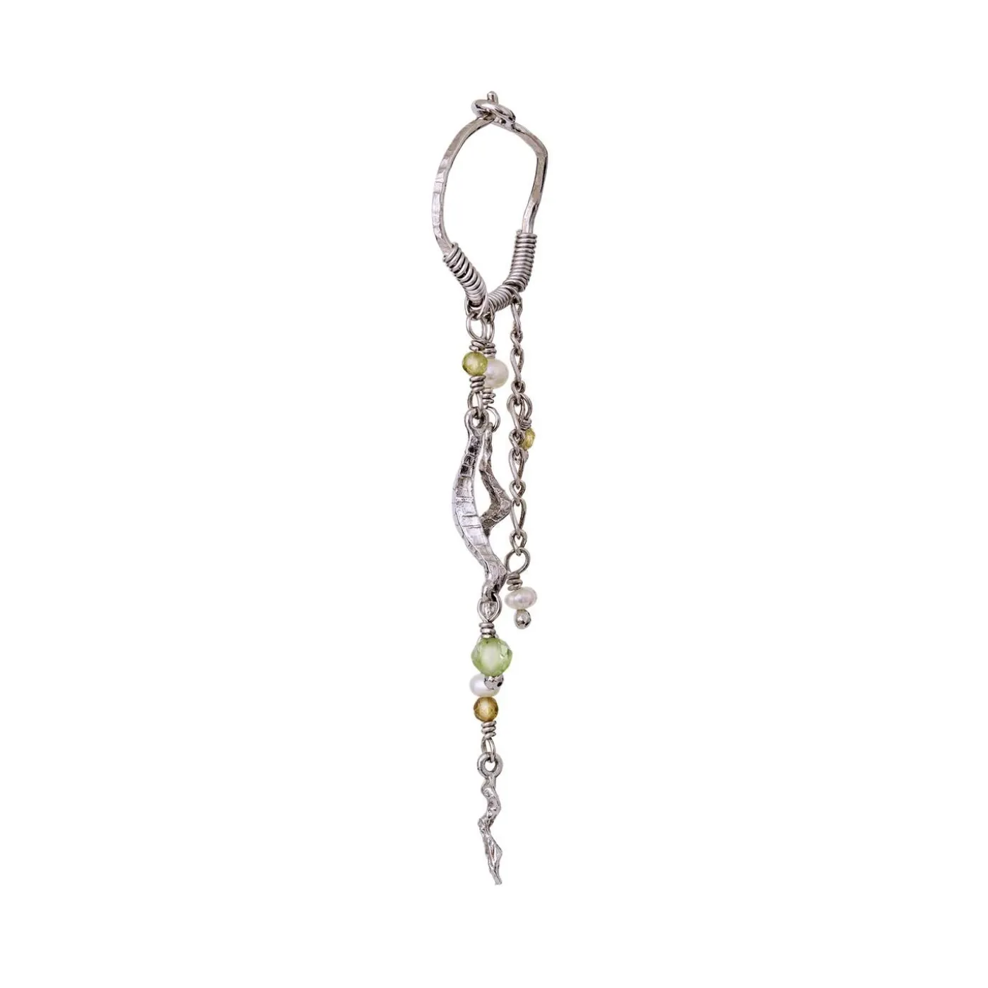 Lad Dig Rive Med Af Naturens Ro Med Maanestens Upcycled Rippling Stream Single Ørering. Denne Ørering Er Fremstillet I København Som En Del Af Vores Upcycled Recycled-Kollektion Og Afspejler Den Fredfyldte Skønhed I En Rislende Bæk. De Buede Former Bugter Sig Yndefuldt Mellem Kæder Og Perler I Beroligende Grønne Toner, Der Leder Tankerne Hen På Vandets Blide Strøm Gennem En Bæk.