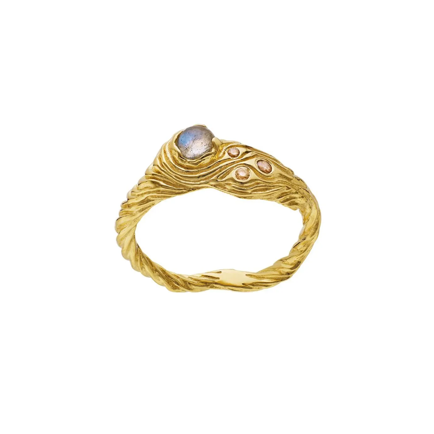 Oceana Er Inspireret Af Havet Og Dets Smukke Mystiske Væsen. I Midten Sidder En Smuk Labradorit Omkranset Af Funklende Champagne Zirkonia. Labradoriten Er Den Perfekte Ledsager, Der Giver Styrke Og Udholdenhed, Hvis Du Ikke Længere Vil Flyde Med Strømmen, Men I Stedet Vil Svømme Egne Veje.