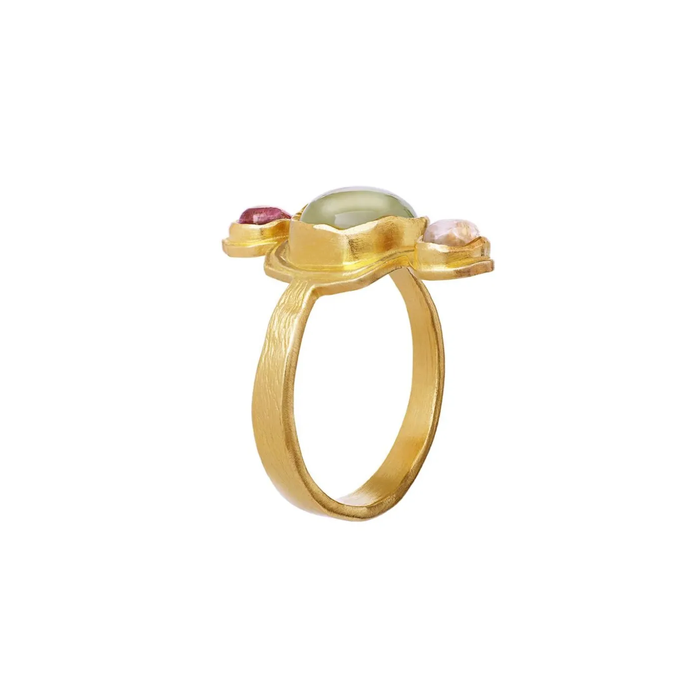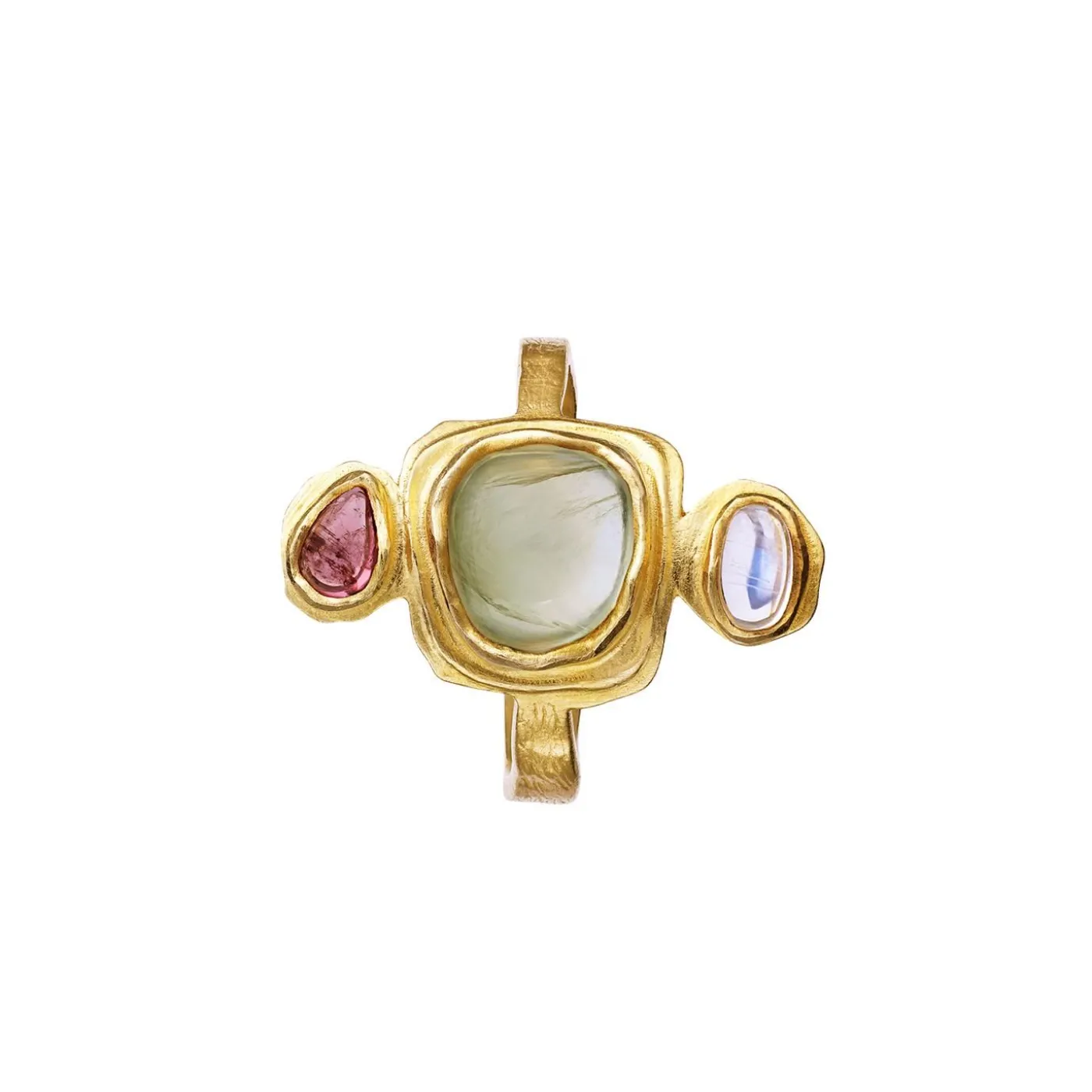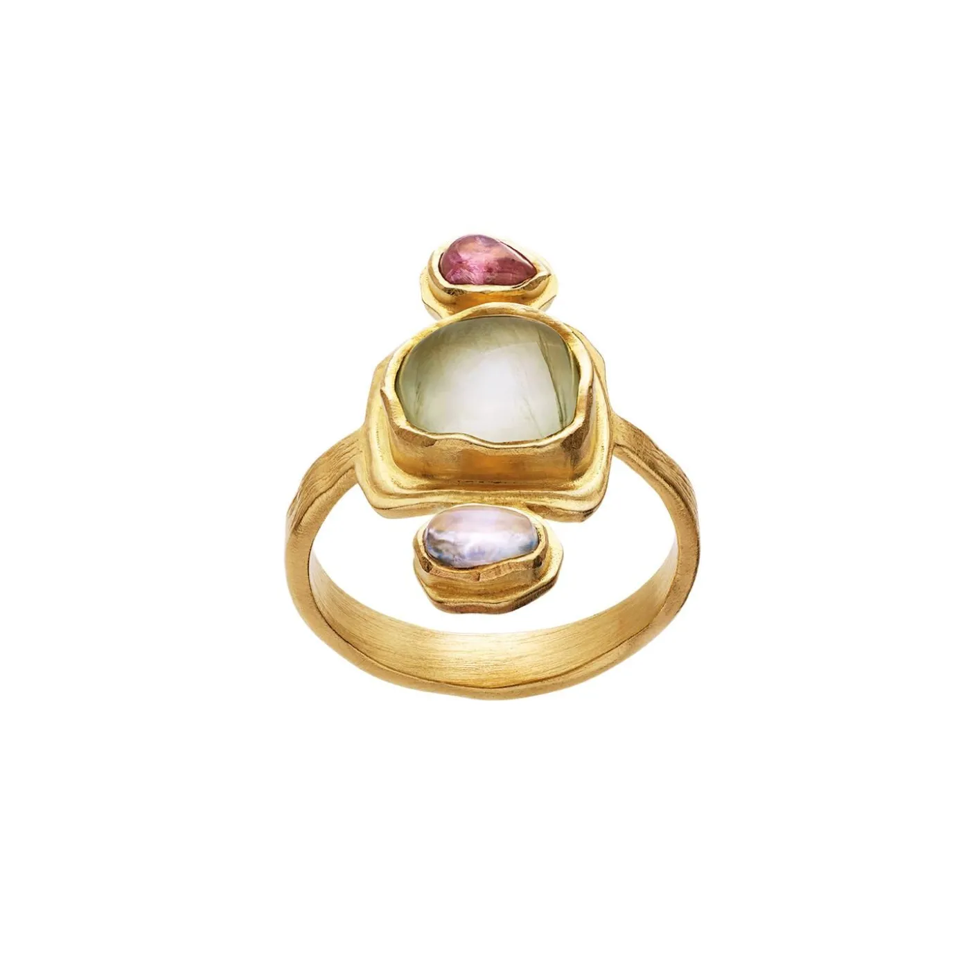 Sara Er En Samling Af Gode Energier Med Sin Grønne Prehnit, Pink Turmalin Og Månesten. Ringen Er Inspireret Af Sommerens Natur, Der Er Fyldt Med Grønne Nuancer, Lyserøde Blomster Og Den Blå Himmel.