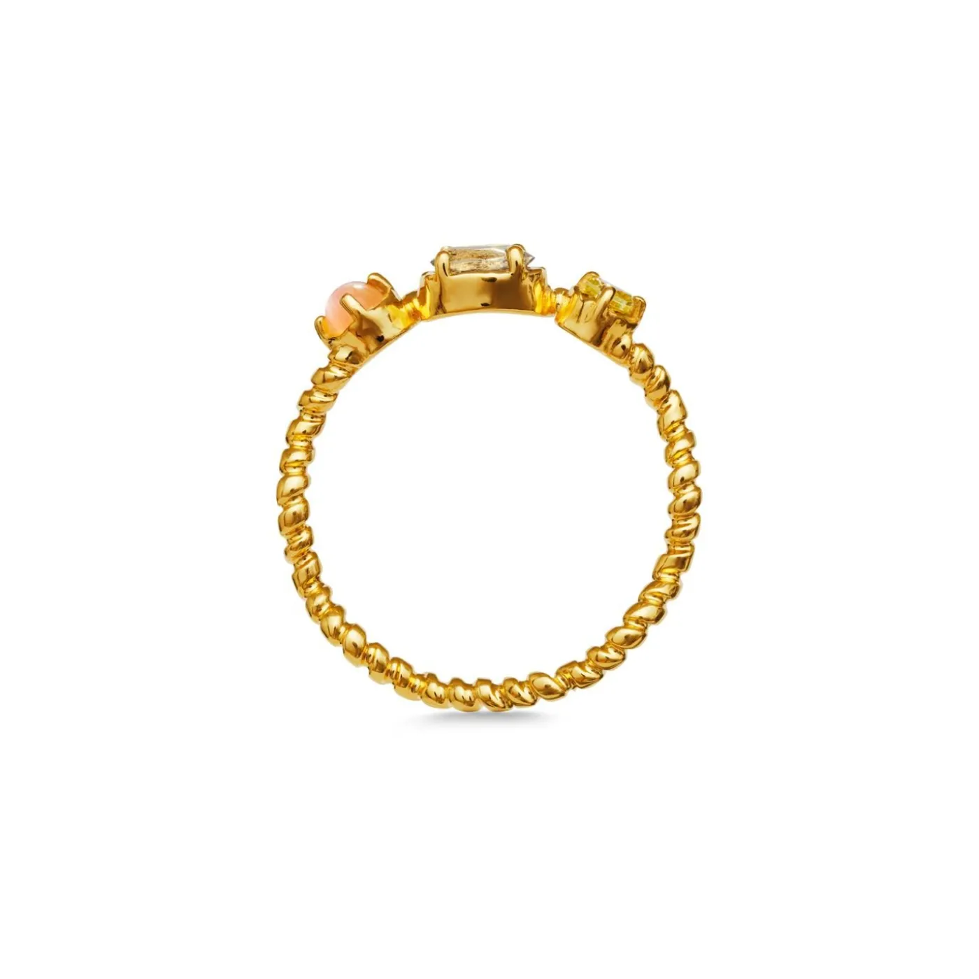 Smuk Ring Med Unik Bølget Ringskinne, Fersken-Månesten, Labradorit Og Grøn Zirkon.