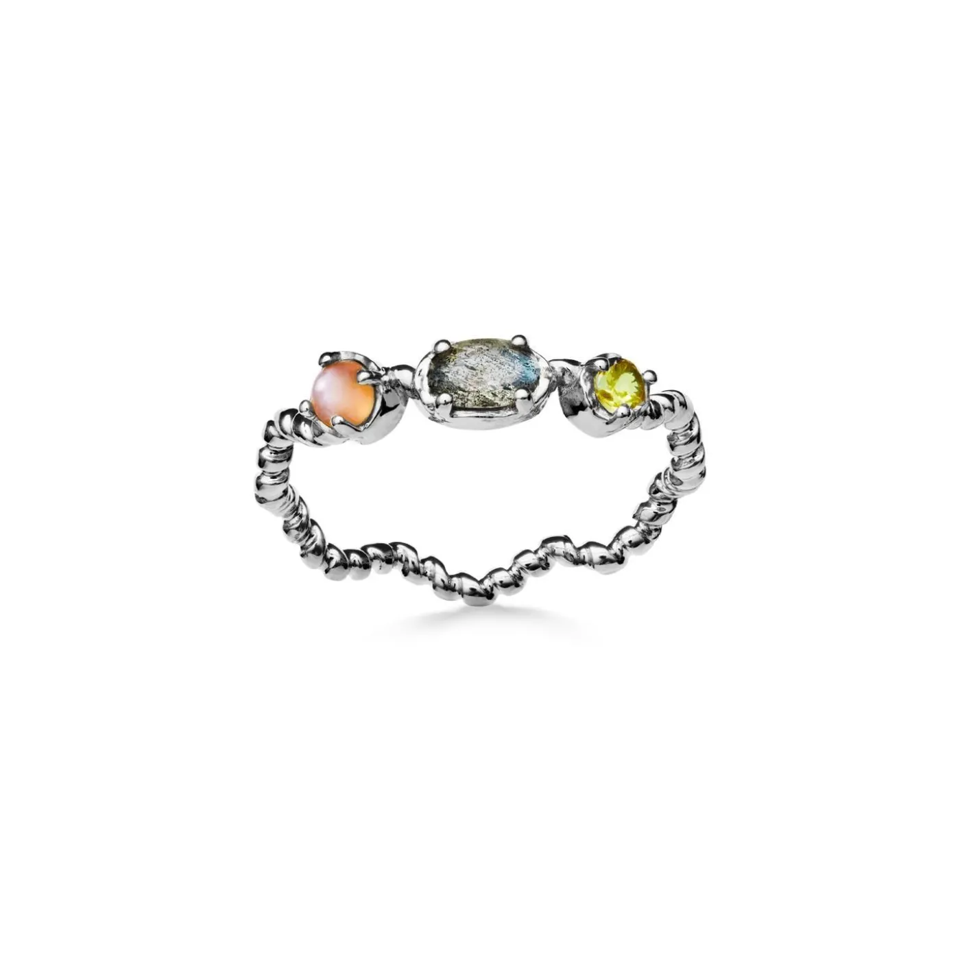 Delikat Ring Med En Unik Bølget Tekstur, Ferskenmånesten, Labradorit Og Grøn Zirkonia.