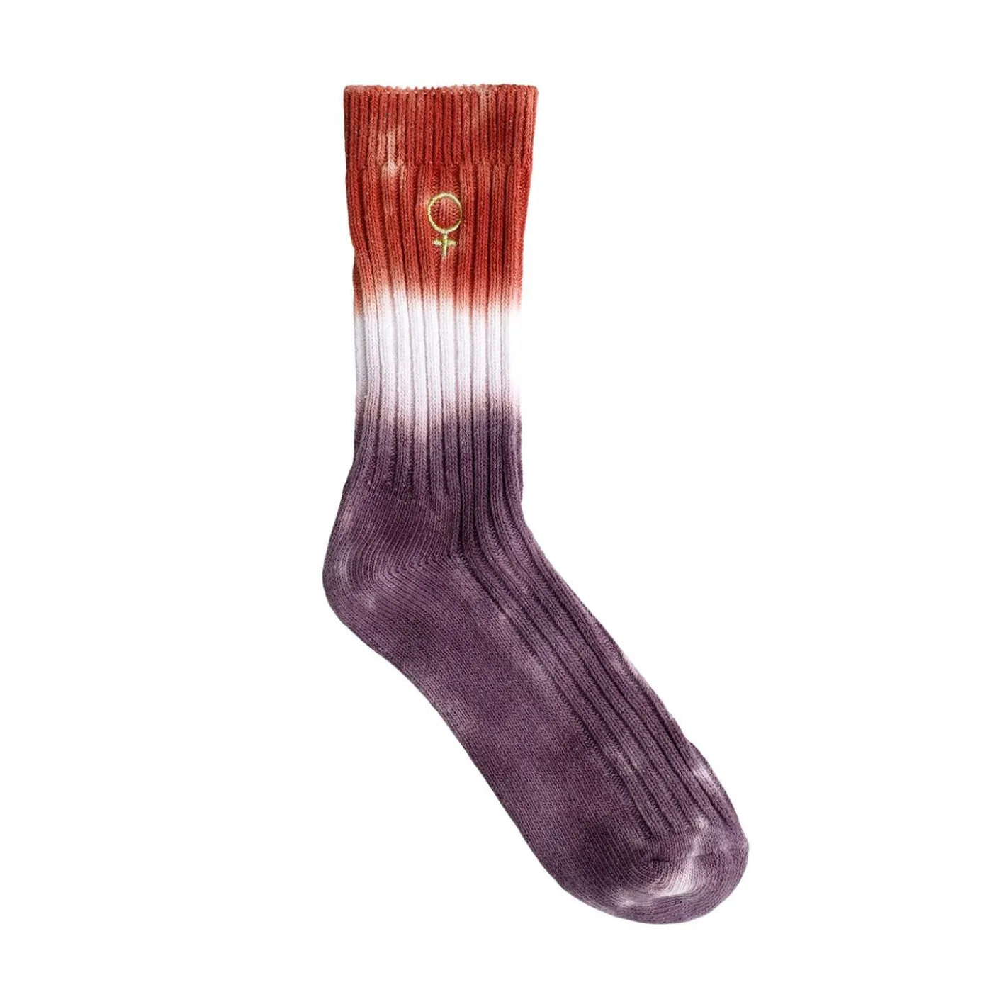 De Drømmende Tie-Dye Strømper, Explorer, Kan Pifte Ethvert Outfit Op. Farven Coral Er Et Miks Af Nuancer Af Mørk Koral Og Lilla Med Et Broderet Venustegn I Guld På Læggen.