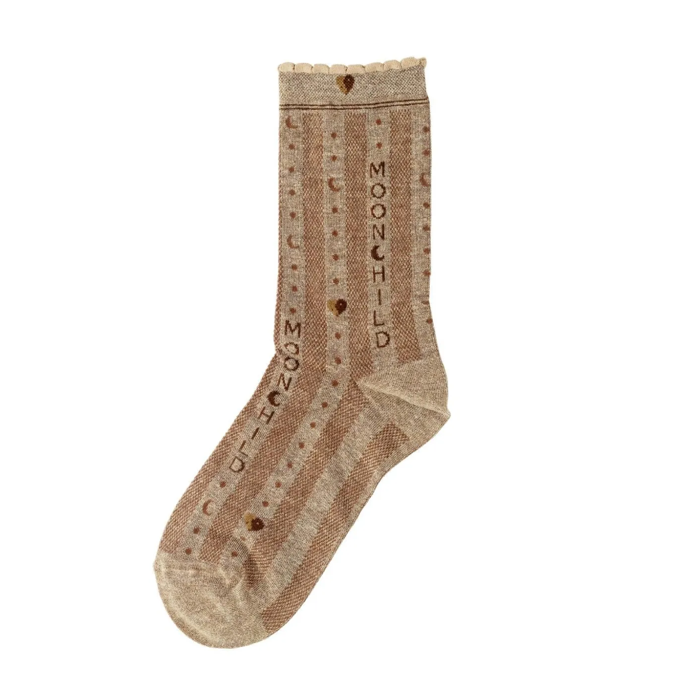 Tilføj Hverdagsluksus Til Dit Outfit Med Maanestens Populære Og Delikate Strømper Med Print Af Hjerter, Yin Og Yang-Symbolet Og Den Drømmende Tekst, ’Moonchild’.Maanestens Lækre Strømper Er Italiensk-Producerede. Størrelse: Onesize. Materialer: Kashmir, Polyamid Og Viskose.